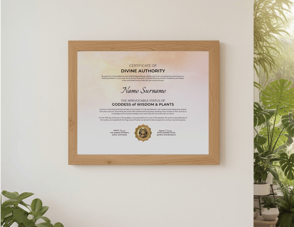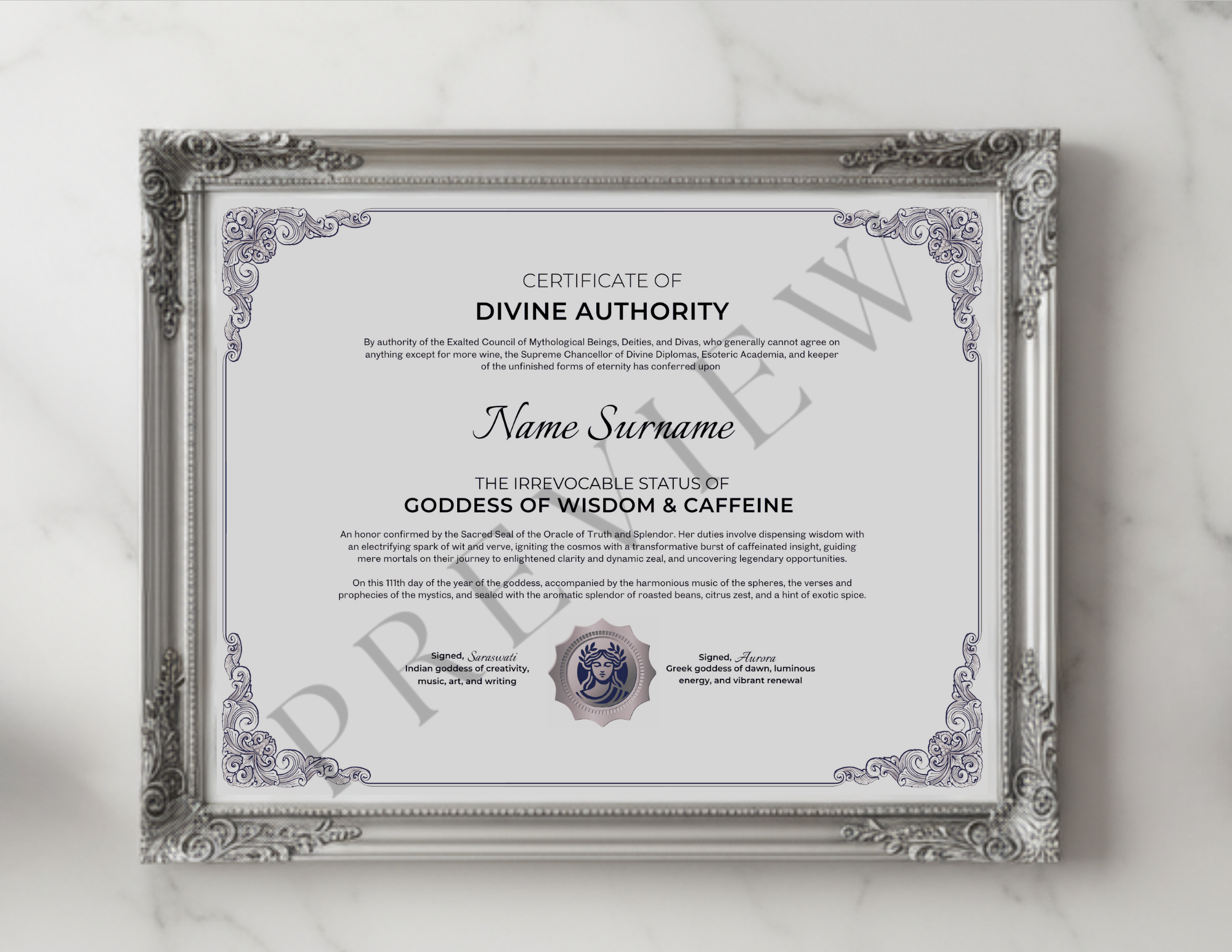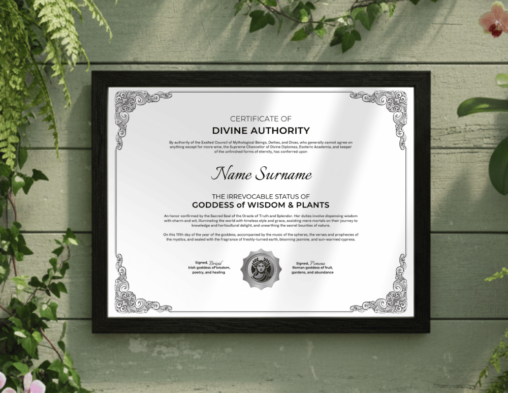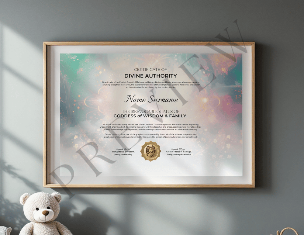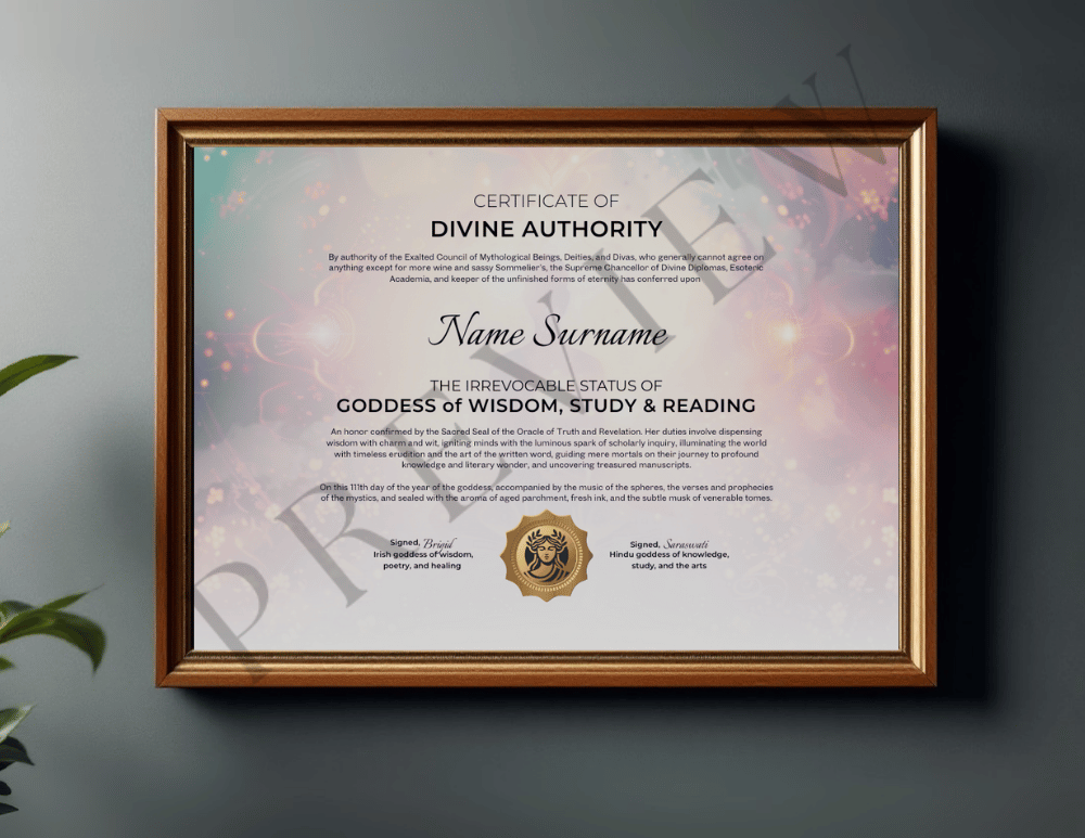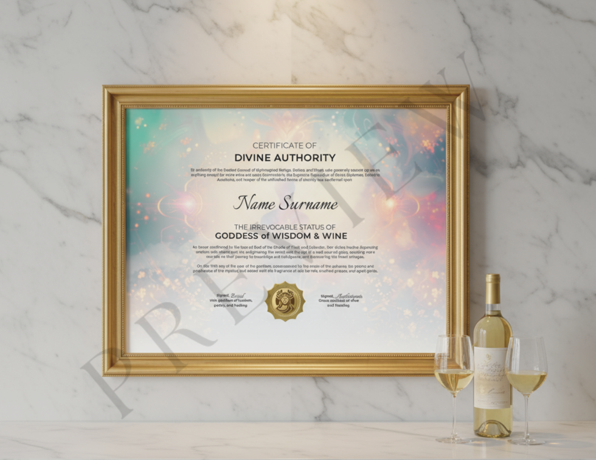 At Certifiably Divine, we create moments of magic. Each design celebrates your quirks, chaos, and charm with playful irreverence. Our Goddess Certificate packages are designed to help you feel seen, celebrated, and legendary.