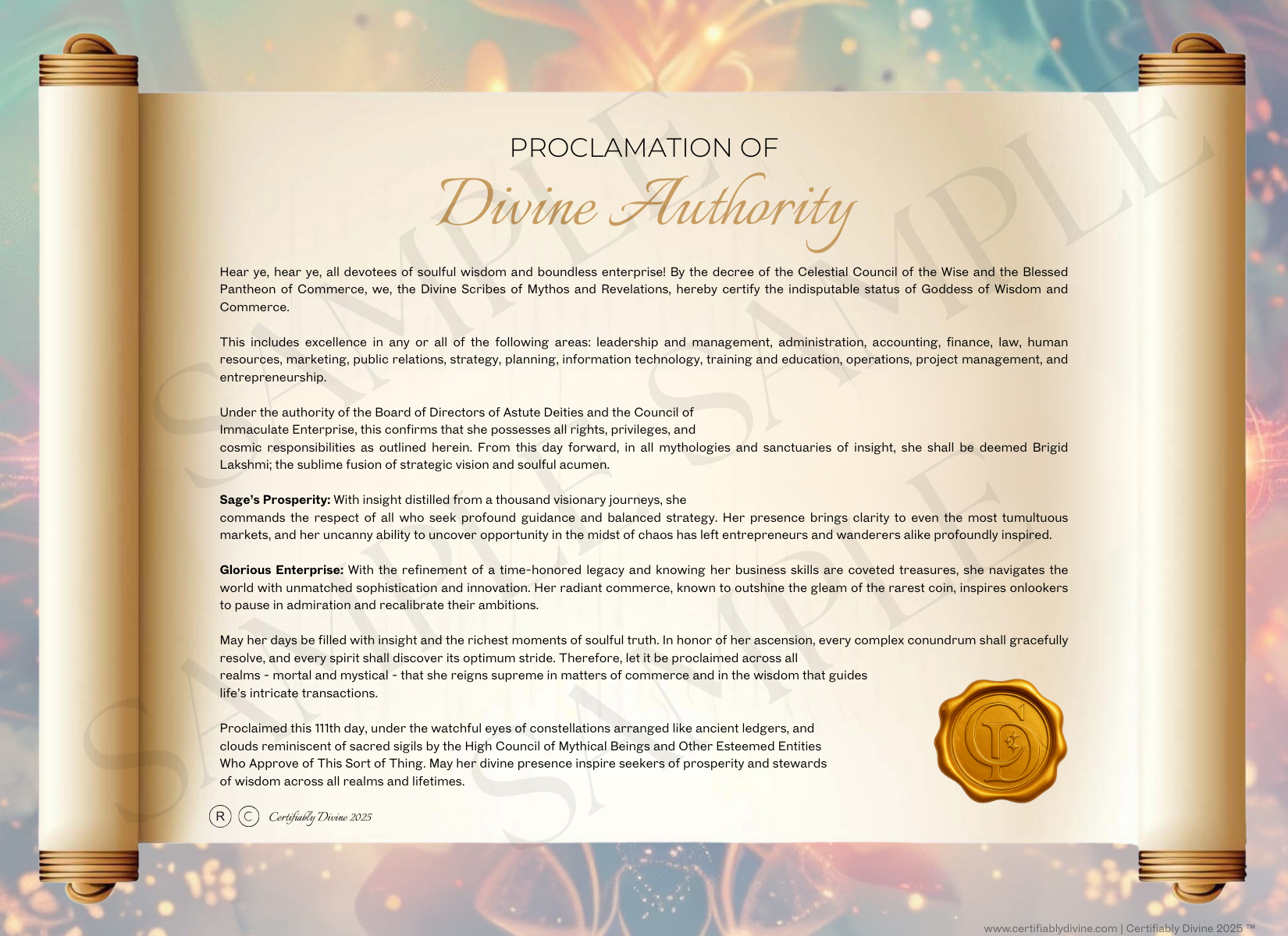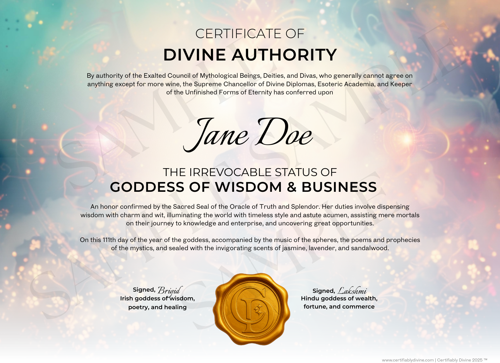 This printable certificate celebrates your divine right to close deals, command rooms, and lead with both strategy and soul. A reminder that your ambition is sacred.