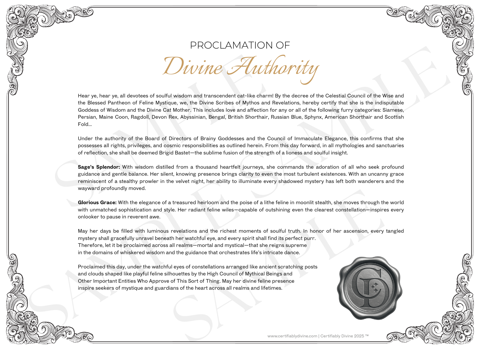 Bow to the feline divine. This printable certificate celebrates your mystical bond with cats—the true oracles of comfort, confidence, and quiet judgment.