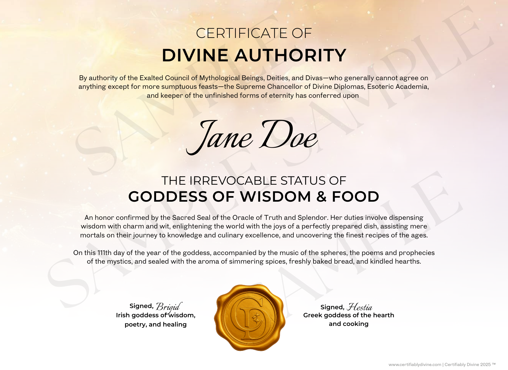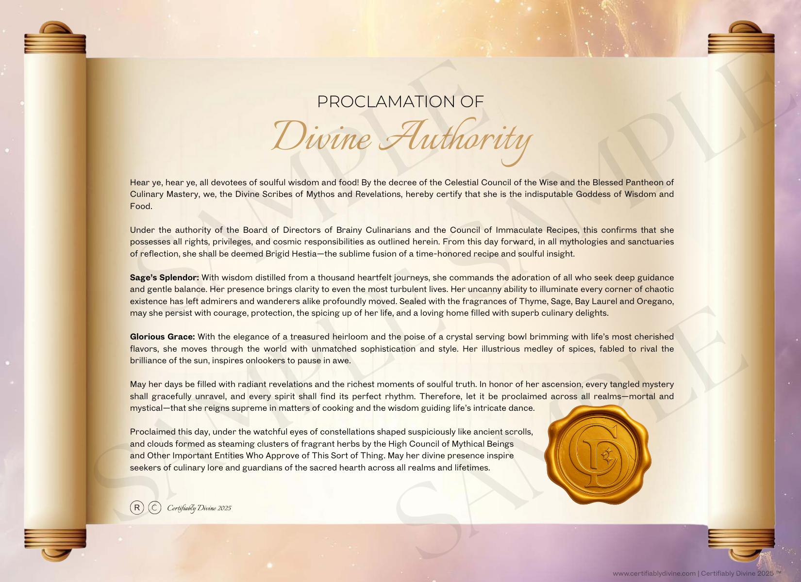 Proclaim your sacred right to feed hearts and bellies alike. This printable certificate honors your divine power in the kitchen, and your gift for turning ingredients into edible joy.